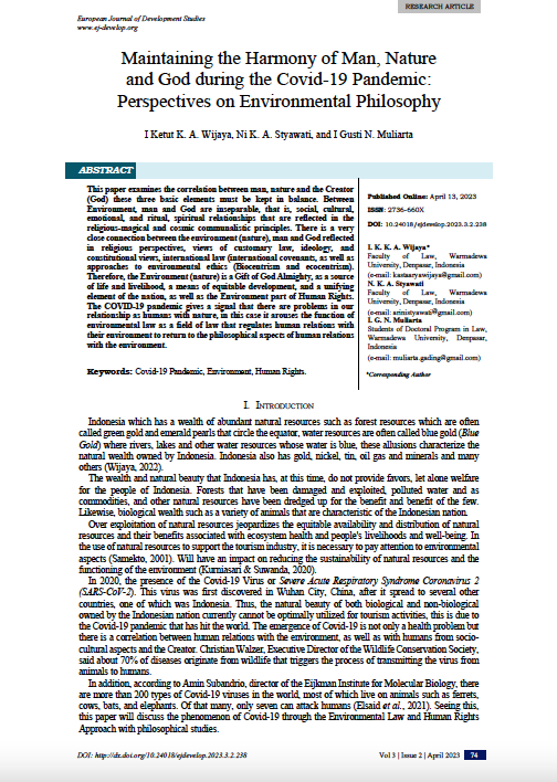 Maintaining the Harmony of Man, Nature and God during the Covid-19 Pandemic: Perspectives on Environmental Philosophy